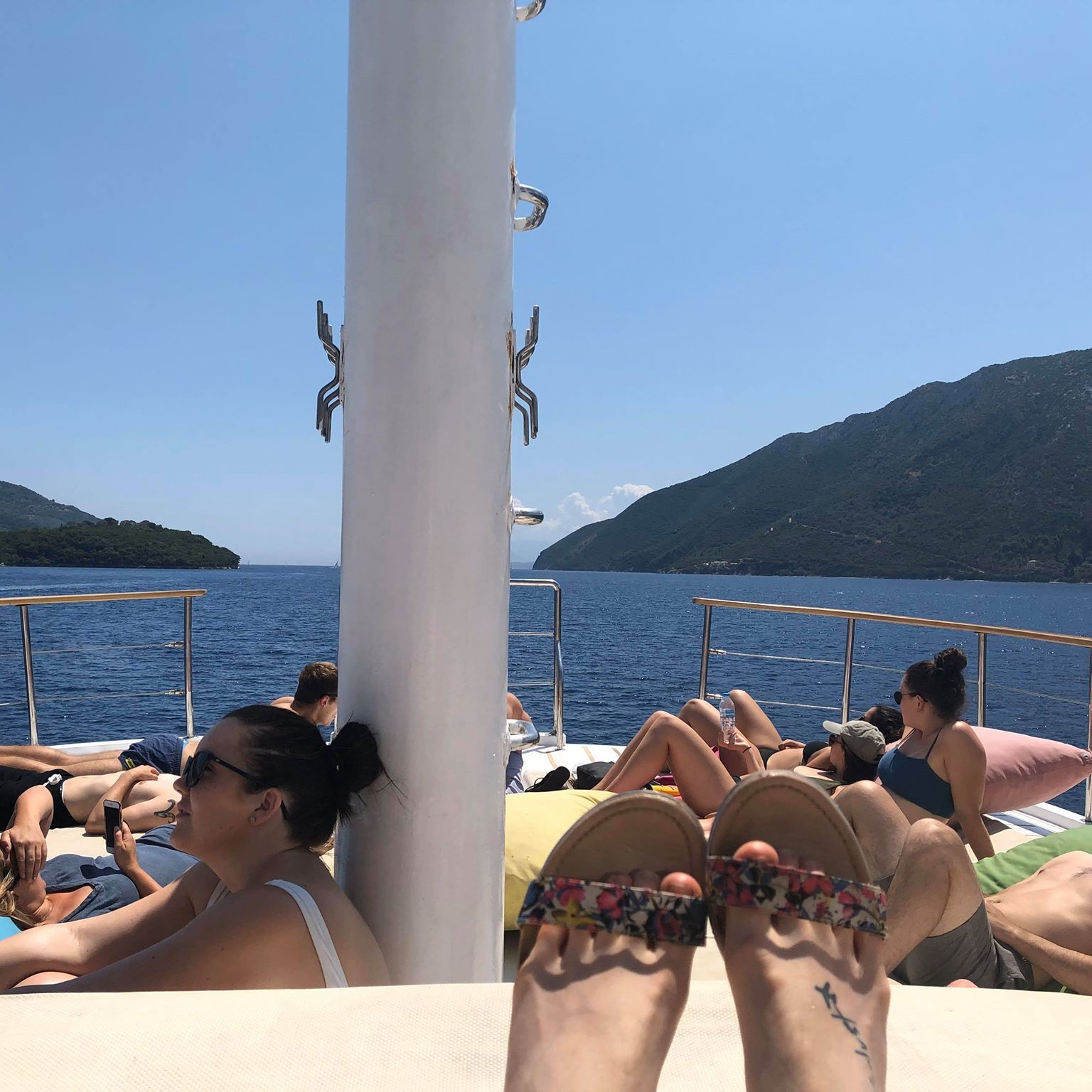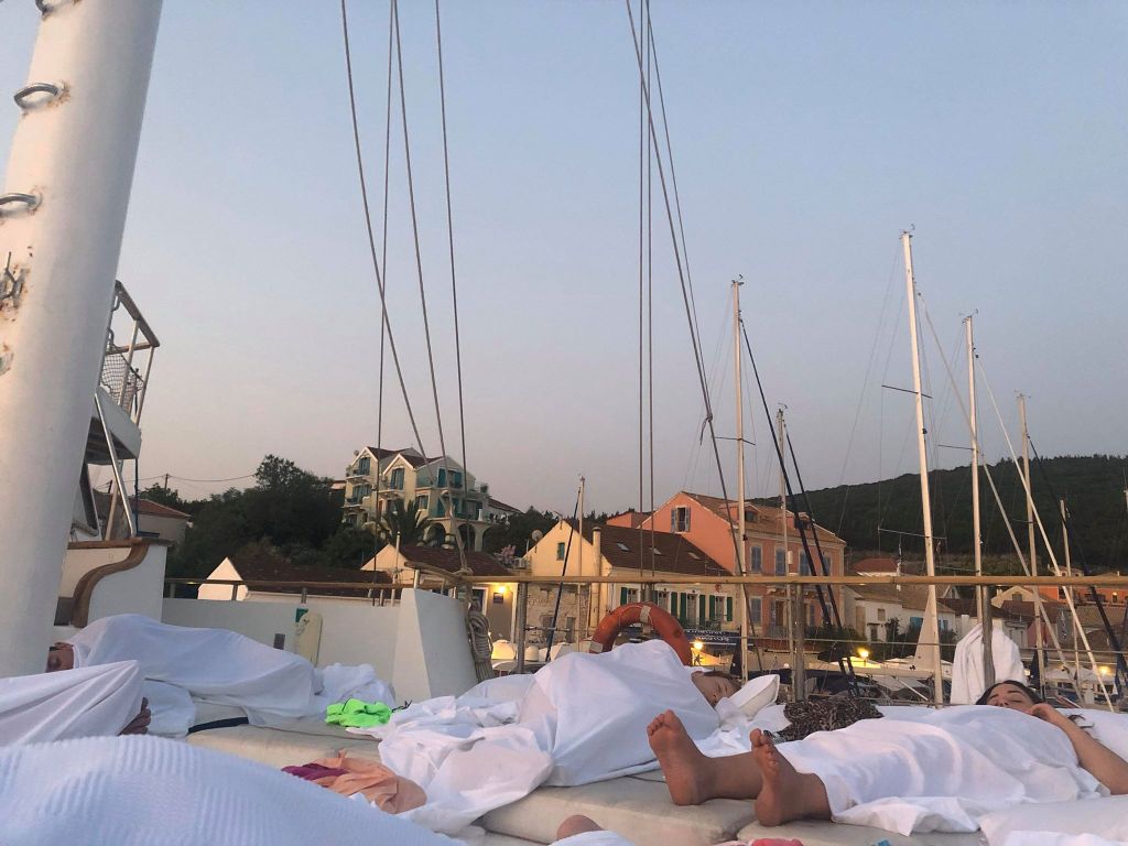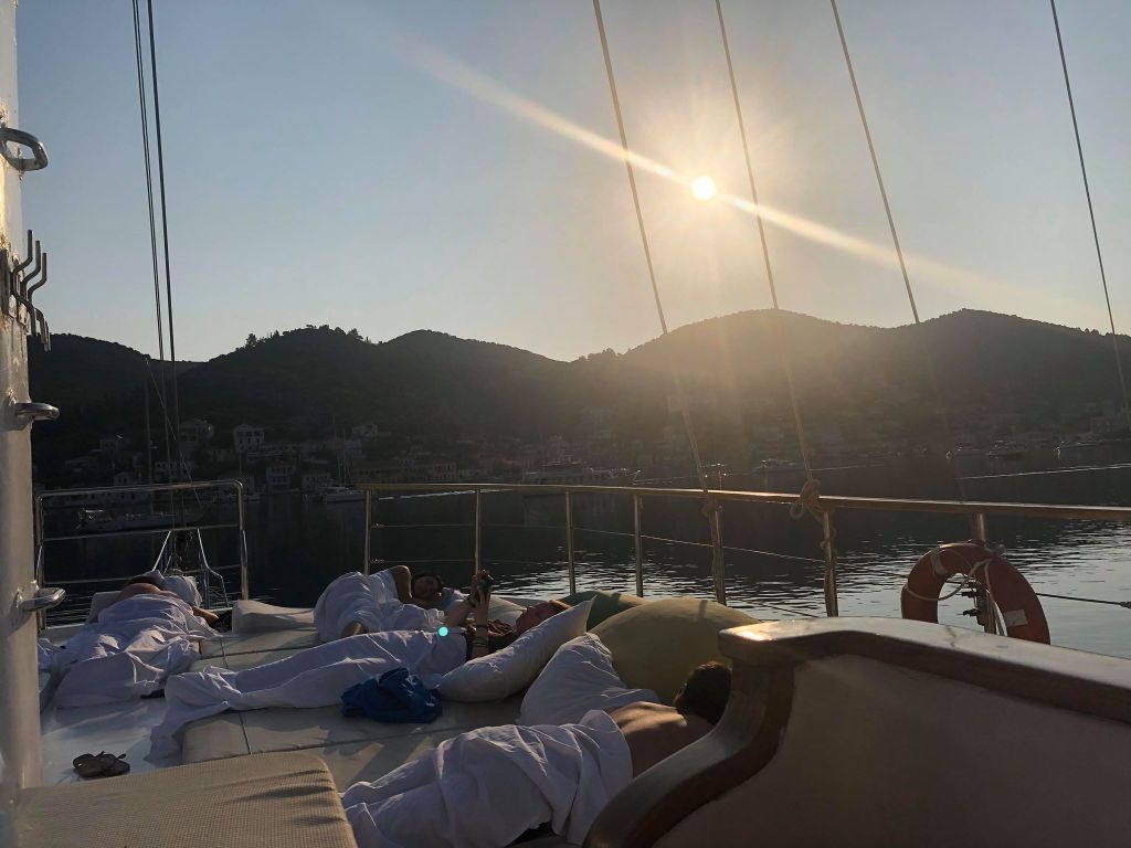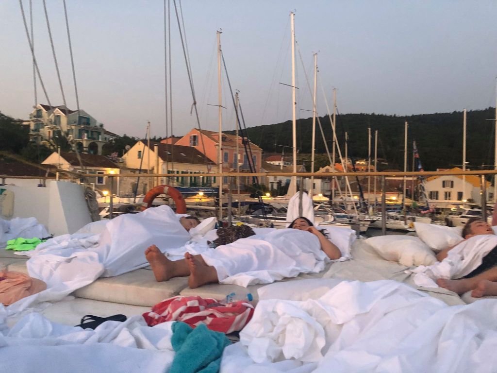 It was a totally amazing experience. There were just pillows, cushions and lilos everywhere to make one massive mattress for us all to collapse onto which was convenient for those of us stumbling back in the early hours after a few too many drinks singing about a waddling duck (very random I know but it makes for some good story telling). Wandering around the deck wrapped in sheets to look like togas and hearing all the Greek music blurting out from the restaurants along the seafront made it a lovely scene and surprisingly, it was extremely comfy so I got the best nights sleep I had in a long time! As a bonus, we got to wake up to the gorgeous sunrise every morning whilst inhaling the scent of eggs cooking down below.
